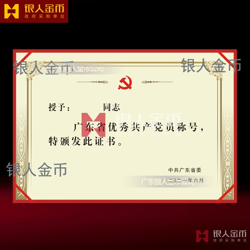 中共廣東省委組織部兩優一先獎牌獎章證書優秀共產黨員獎勵證書_全省優秀黨共產黨員榮譽證書_廣東省優秀共產黨員榮譽稱號榮譽獲獎證書